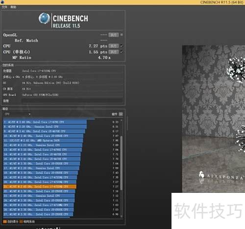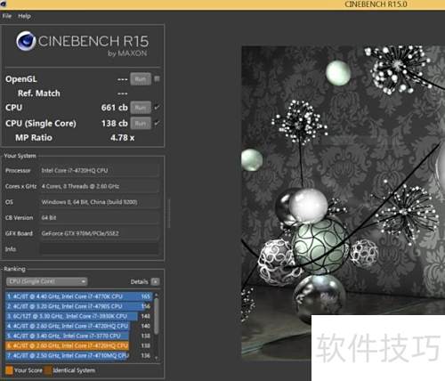 35、 在掌握处理器基础参数后,我们通过CINEBENCH R11.5与R15两款专业测试软件对其性能进行了全面评估。这两款工具可直观反映处理器在单核心与多核心任务中的实际表现。测试过程中,酷睿i7-4720HQ展现出出色的运算效率,迅速完成了全部测试流程。最终成绩显示,其在CINEBENCH R11.5中单核得分为1.55 PTS,多核得分为7.27 PTS;在CINEBENCH R15中,单核成绩达到138 CB,多核成绩为661 CB。对比同配置机型,雷神911M所搭载的该处理器性能释放充分,各项跑分表现优异,处于同类产品前列,充分体现了其在高性能笔记本中的竞争力与稳定性。