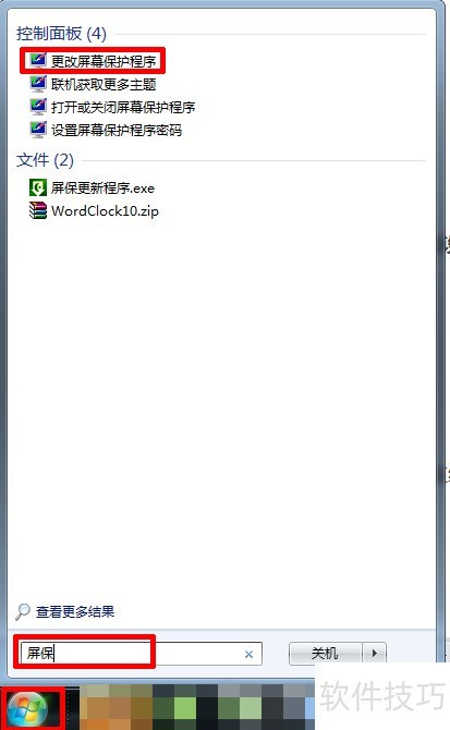 3、 安装完毕后,点击开始菜单,在搜索框输入屏保,选择更改屏幕保护程序即可。