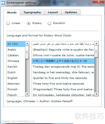 7、 返回屏幕保护设置,点击设置后窗口直接弹出,无错误提示,界面支持多种语言及三种布局选项。