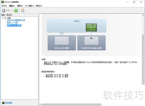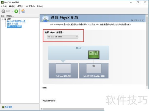 2、 在NVIDIA控制面板中,进入PhysX设置,将处理器指定为独立显卡以提升性能。