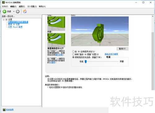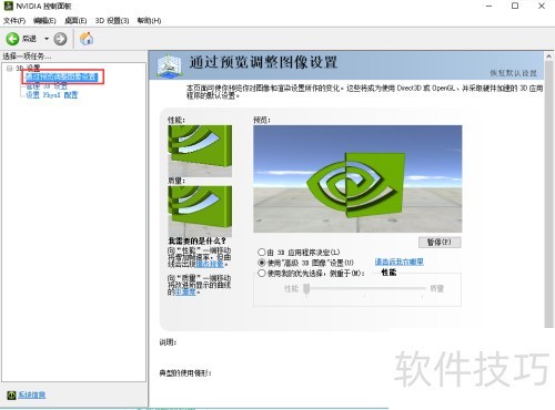 4、 在NVIDIA控制面板中,启用预览调整图像设置,选择使用我的优先级,并将性能设为优先。
