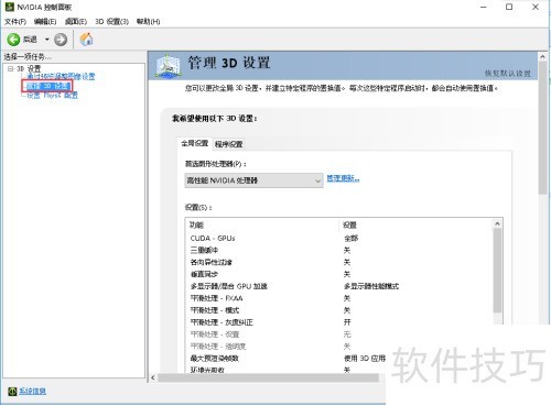 6、 在NVIDIA控制面板的管理3D设置中,将全局设置的图形处理器设为高性能的NVIDIA显卡。
