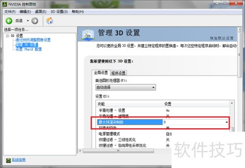 3、 进入管理3D设置,将最大预渲染帧数设为3,若CPU性能较强,可调至5,具体设置参考下图。