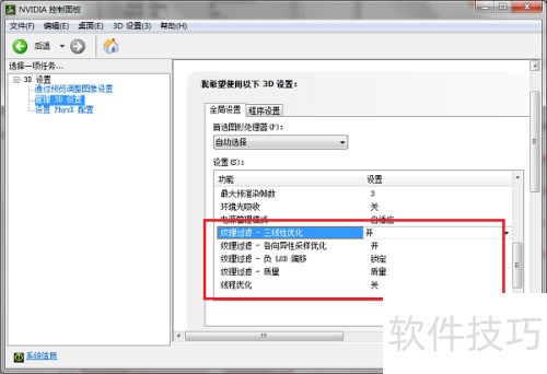 4、 进入管理3D设置,开启全部纹理选项,关闭线程优化,具体操作所示。