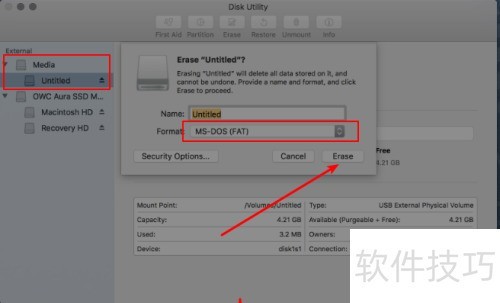 3、 打开Mac的磁盘工具,左侧选择U盘,点击上方抹掉按钮,格式选择FAT,按图示箭头指示操作并确认抹掉。等待几分钟完成格式化后,拔出U盘重新插入即可。