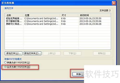 8、 选择合并为单个PDF文件,点击转换按钮完成操作。
