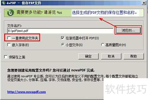 9、 请指定生成PDF文件的存储位置及文件名。勾选始终使用此文件夹后,后续转换的文件将默认保存至该目录,方便查找。若同时勾选在浏览器中打开PDF,且系统已安装PDF阅读器,则转换完成后文档会自动打开浏览。