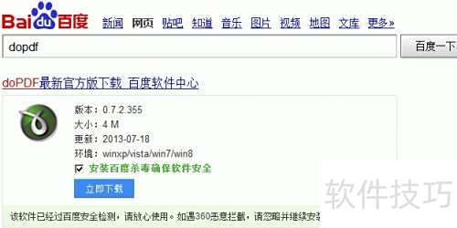 1、 要高效完成工作,需先准备好工具。可在网上下载DoPDF虚拟打印软件,只需在百度搜索栏输入DoPDF,即可通过百度软件中心安全下载,操作简便,所示。