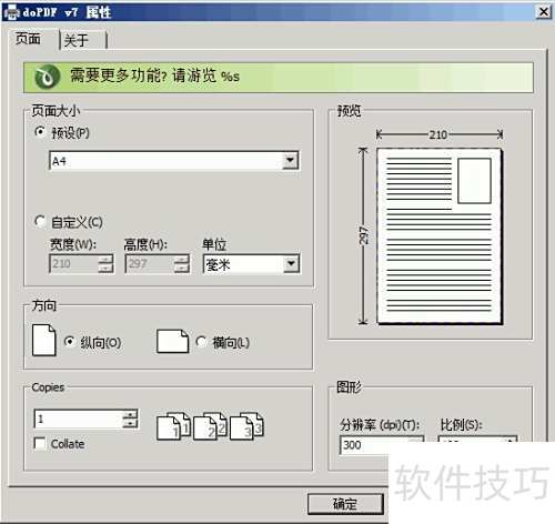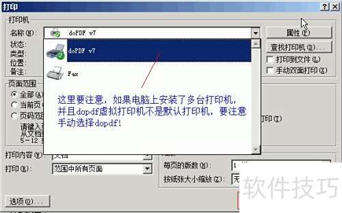 8、 注意此处:若安装了多台打印机,务必在列表中选择DoPDF虚拟打印机,切勿选实体打印机,以免实际打印文件。还可通过点击属性来设置纸张大小等参数。