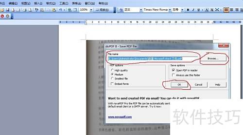 6、 随后将弹出doPDF 8 - 保存PDF文件窗口,点击浏览按钮,选择文件保存路径并输入文件名,确认无误后点击OK完成保存操作。