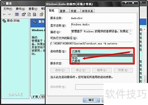 3、 双击打开Windows Audio服务后,启用按钮呈灰色无法操作。需先在常规选项中,将启动类型下拉菜单设为自动或手动,点击应用后,启动按钮方可使用。