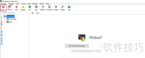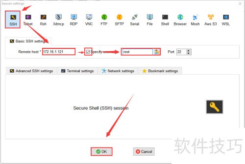 10、 启动MobaXterm,选择Session,于设置界面填写服务器登录信息后,点击确定完成配置。