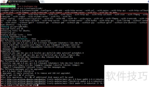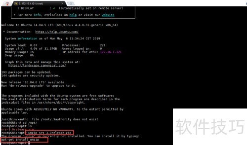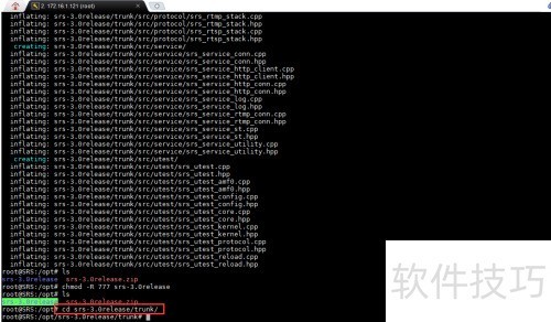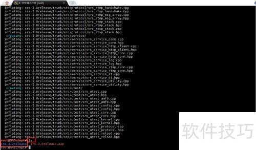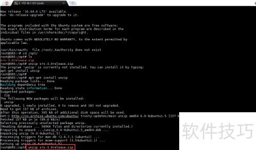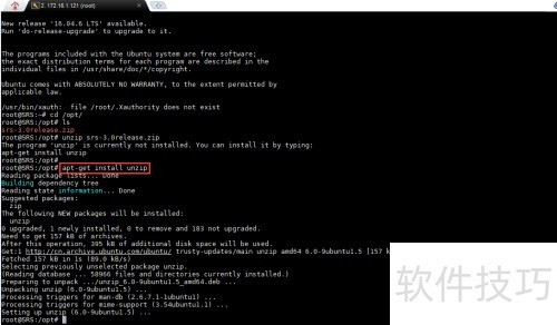 16、 通过apt-get install unzip命令安装unzip工具,随后执行unzip srs-3.0release.zip命令,将srs-3.0release.zip压缩文件解压到当前目录,完成解压操作以便进行后续的文件处理与使用。