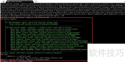 19、 进入该目录后,执行以下编译命令:./configure --x86-x64 --with-http-server --with-ssl --with-nginx --with-http-api --with-http-callback --with-stat --with-ffmpeg --with-transcode --with-ingest --with-stream-caster --with-hls --with-dvr,随后运行make命令完成编译。该配置指令集成了多种功能模块,包括HTTP服务器支持、SSL加密传输、Nginx集成、HTTP接口与回调机制、状态统计功能、音视频处理工具FFmpeg、转码能力、流媒体采集、流推送服务,以及HLS协议和DVR录制功能。通过这一系列参数的设定,可构建一个功能完备的流媒体服务环境。编译过程将根据系统环境自动检测依赖项并生成对应的可执行文件,确保各组件协同工作,最终生成符合需求的运行程序,为后续部署和运行提供基础支持。