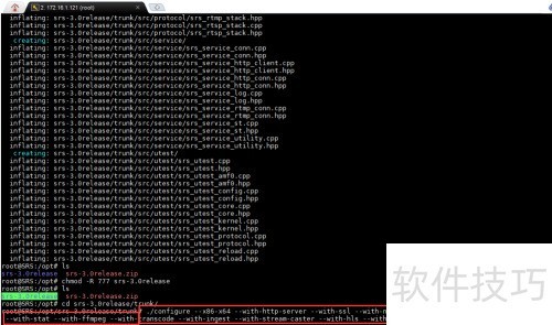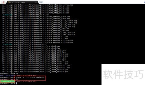 17、 解压后用ls查看文件,再执行chmod -R 777 srs-3.0release命令,修改目录及其内容的权限为可读、可写、可执行。