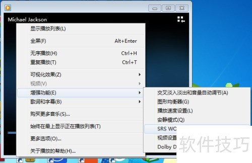 7、 随意播放一首歌曲,用鼠标右键点击播放器中央区域(即播放视频时显示画面的位置),在弹出的菜单中选择增强功能,然后点击SRS WOW效果即可开启。