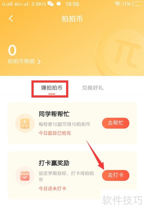 10、 进入后点击赚拍拍币,选择去打卡即可。
