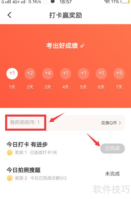6、 完成打卡即可获得相应拍拍币奖励。