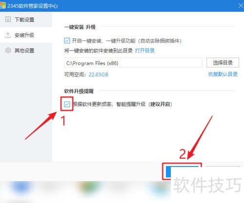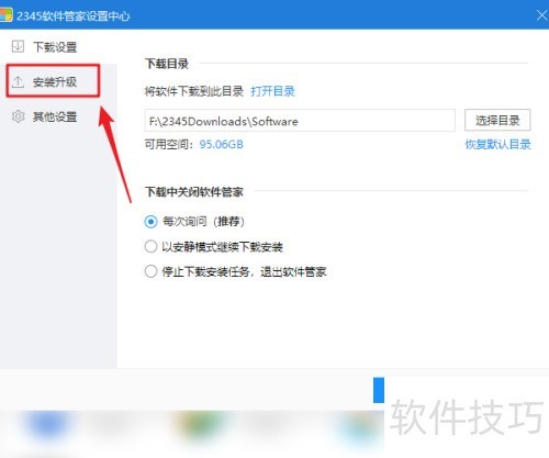 4、 进入2345软件管家设置中心,选择左侧的安装升级选项,具体操作所示。