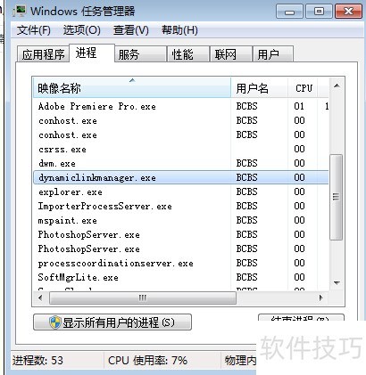 4、 双击打开C盘中Program FilesCommon FilesAdobeDynamicLink文件夹内的DynamicLinkManager程序,启动后可在任务管理器中观察到对应进程正在运行,具体状态所示。该操作可验证程序是否正常加载。