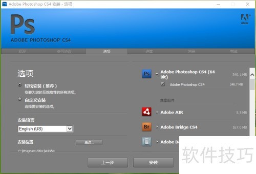 6、 安装Adobe Photoshop CS4时,若选择自定义安装,右侧组件将默认全选,可根据实际需要取消不需要的部分,确认后点击安装即可完成设置。
