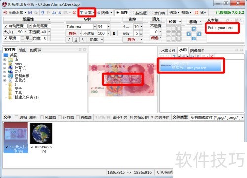 5、 调整文字水印的位置、颜色、字体及透明度等参数。