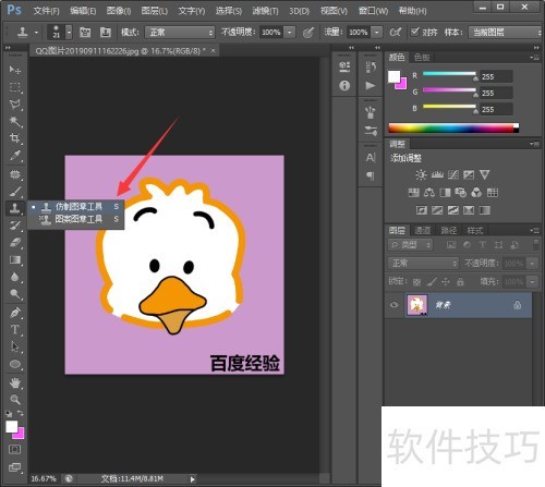 11、 点击左侧工具栏第九个图标,从下拉菜单中选择仿制图章工具即可。