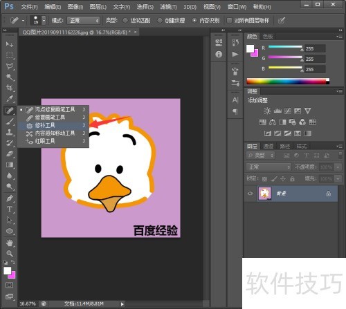 19、 在左侧工具栏中点击第七个图标,从下拉菜单里选取修补工具即可。