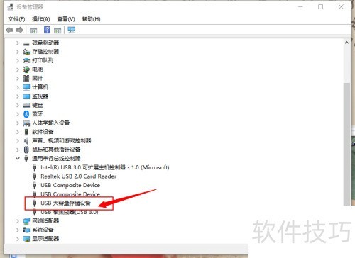 3、 此时,展开通用串行总线控制器,右键点击其中的USB大容量存储设备选项。