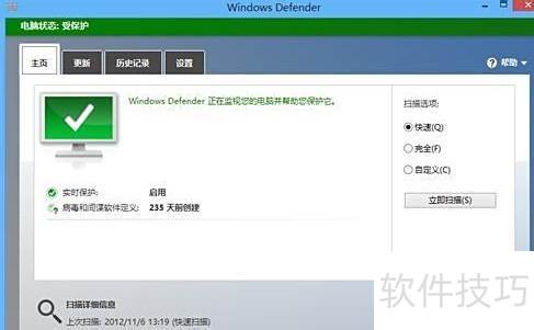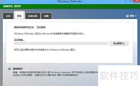 5、 切换至更新选项卡,可将病毒库升级至最新版本,有效查杀新出现的各类病毒。此外,Windows Defender还提供历史记录查询与多种自定义设置,满足不同需求。不过对大多数用户而言,系统默认配置已完全能够保障日常使用安全,无需额外调整。