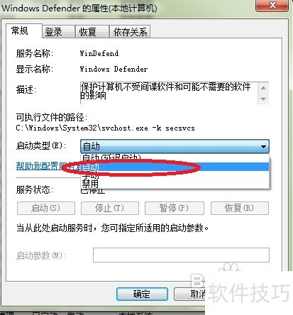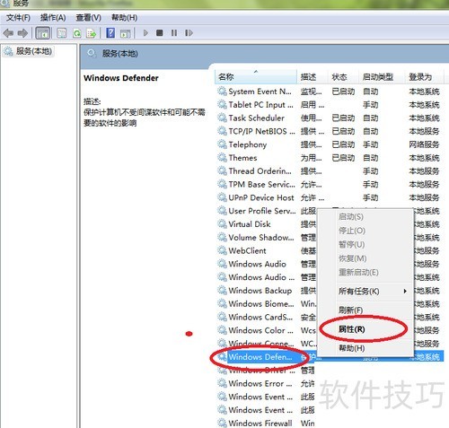 3、 右键点击Windows Defender服务,选择属性或双击打开,即可进入属性设置界面。