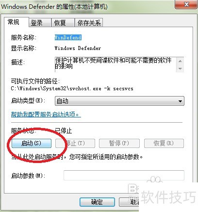 5、 重复第三步操作,点击启动按钮,即可成功开启Windows Defender服务。