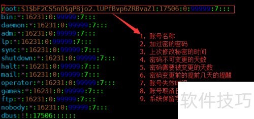 6、 编辑 /etc/shadow 文件,详解九个字段的含义及作用。