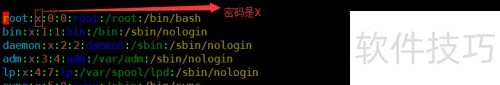 4、 在/etc/passwd文件中,第二个字段显示为x,实际密码信息并未直接存储于此。