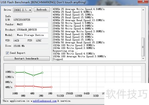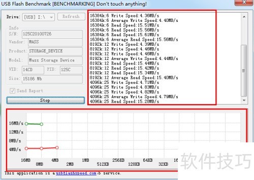 5、 由于测速耗时较长,此处仅作演示:绿线端显示16MB/s为读取速度,红线端4MB/s为写入速度。
