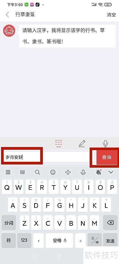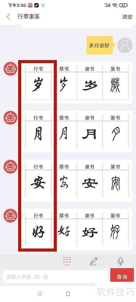 2、 进入行草隶篆页面,输入岁月安好后点击查询即可。