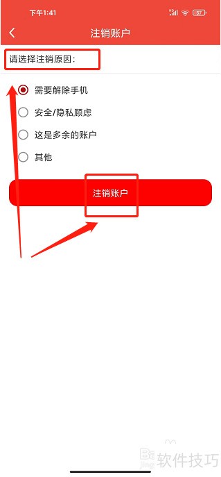 8、 进入账户注销页面,选择原因后点击确认注销。