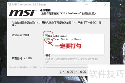 3、 安装时一路点击下一步,直至进入组件选择界面,务必勾选Rivatuner Statistics Server。若该组件无法正常安装,可先确认系统版本是否兼容,若仍存在问题,建议通过百度搜索对应安装包,下载后手动安装即可完成配置,确保软件功能完整运行。