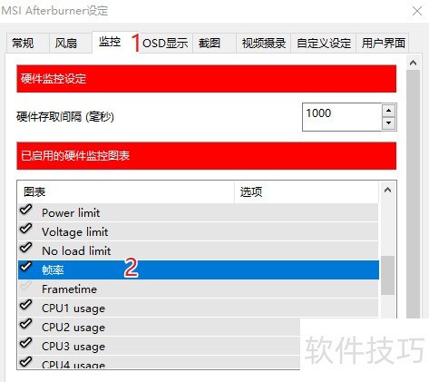 8、 在已启用的硬件监控图表中选择需监控的项目,例如帧率,点击后使其呈现高亮蓝色即可。