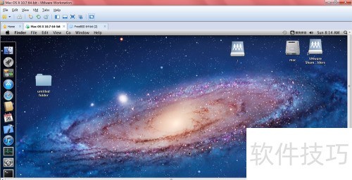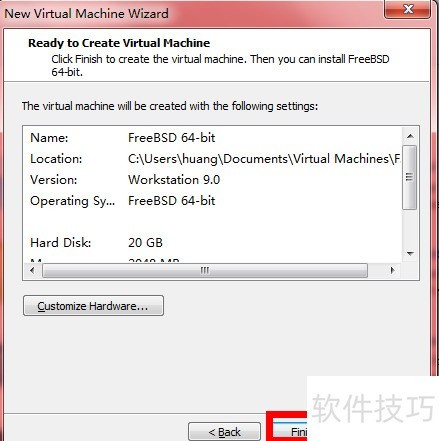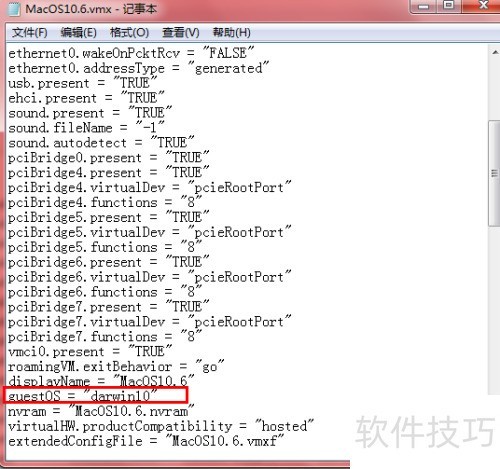 21、 进入已保存的虚拟机目录,找到并用记事本打开vmx文件,将其中的guestOS = freebsd-64修改为guestOS = darwin10,保存更改后即可完成系统类型设置。