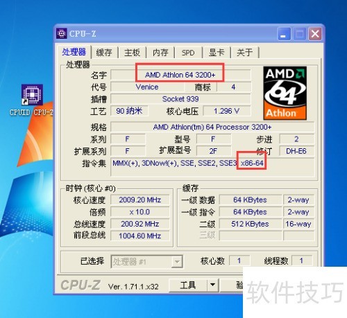 4、 上面介绍了不使用软件的查询方法,接下来说明如何借助工具进行检测。推荐三款轻量软件:首先是CPU-Z,顾名思义,专用于检测处理器信息。下载安装后打开软件,可查看CPU型号,通过搜索型号或观察指令集如x86-64、EM64等标识,即可判断是否为64位系统。