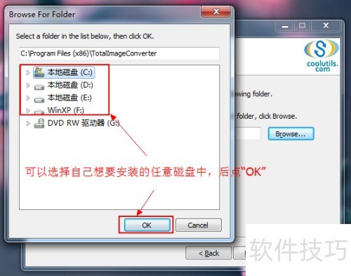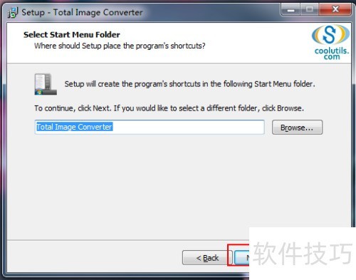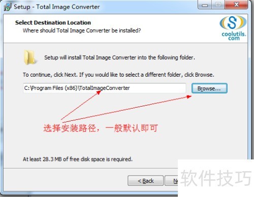 4、 安装时可选择路径,默认路径为C:Program Files (x86)Total Image Converter。若需更改,可点击Browse按钮,手动选取目标文件夹。确认路径无误后,点击Next继续后续安装步骤。请确保所选磁盘空间充足,避免安装失败。