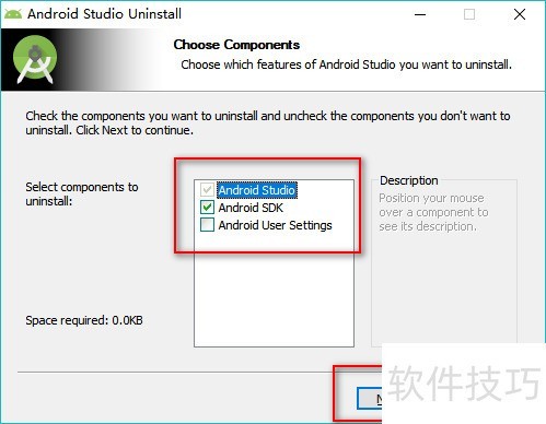 3、 勾选要卸载的项目后点击下一步。若需完全卸载,可同时选中全部三项;若想保留Android环境变量设置,请勿勾选第三项。