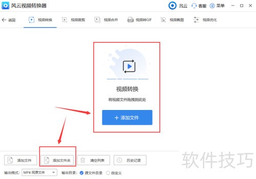 2、 点击中间添加文件导入待转换视频,如需批量添加,可选择左下方添加文件夹功能。