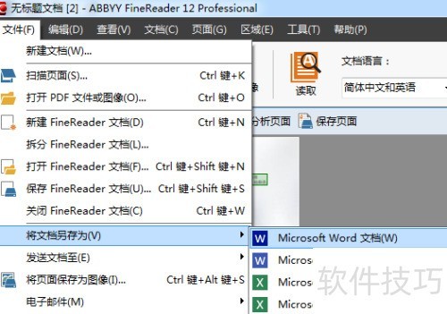 5、 识别完成后,点击文件选项卡中的将文档另存为,然后在弹出菜单中选择Word文档格式。也可通过工具栏的保存下拉按钮,选择另存为Microsoft Word文档,即可生成可编辑的新文件。