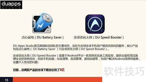 点心省电(DU Battery Saver)是百度首款海外安装量突破一亿的移动应用,现于Google Play平台累计下载已超亿次,可显著优化电池使用,额外提升手机续航达60%。