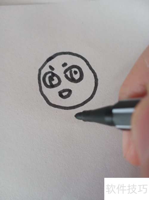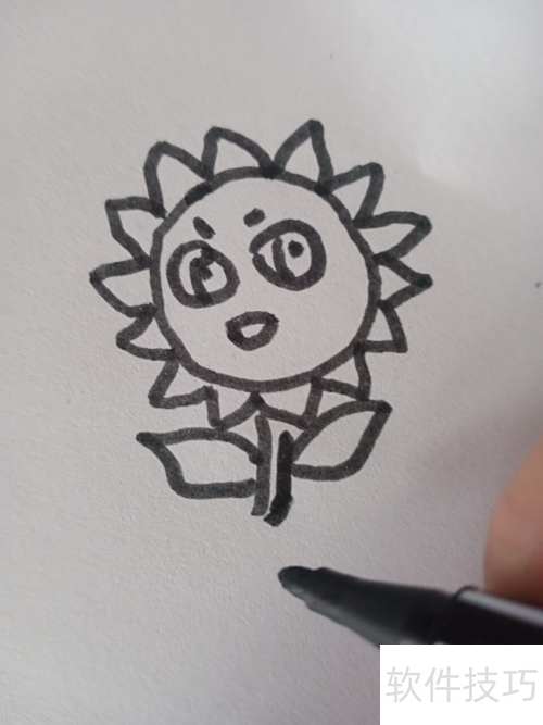 1、 先画太阳花的圆脸,再添上眼睛、鼻子和嘴巴。