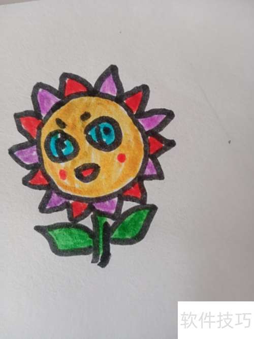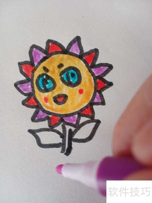 4、 将太阳花的面部涂上黄、蓝、红三色,分别对应脸、眼和嘴。