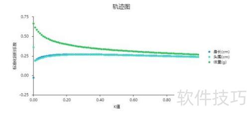 2、 轨迹图展示了在不同K值下,Lasso回归中各变量标准化回归系数的变化趋势。当回归系数随K值增大逐渐趋于稳定时,对应系数基本不变的最小K值可视为最优K值。该判断过程存在一定主观性,例中K值取0.3或0.4均可能合理。通常建议优先选择较小的K值,同时可参考SPSSAU软件自动推荐的最佳K值,以提高分析的准确性与效率。