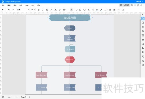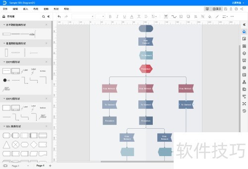 3、 第三步,选中画布中的SDL图,通过左侧符号库调整其形状,或在右侧属性面板选择主题样式,快速切换整体主题。